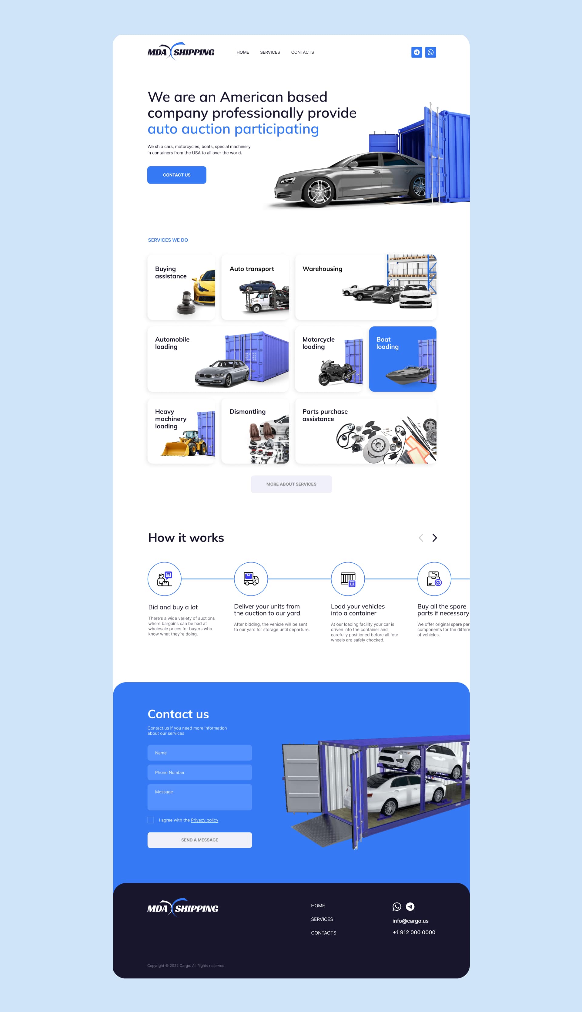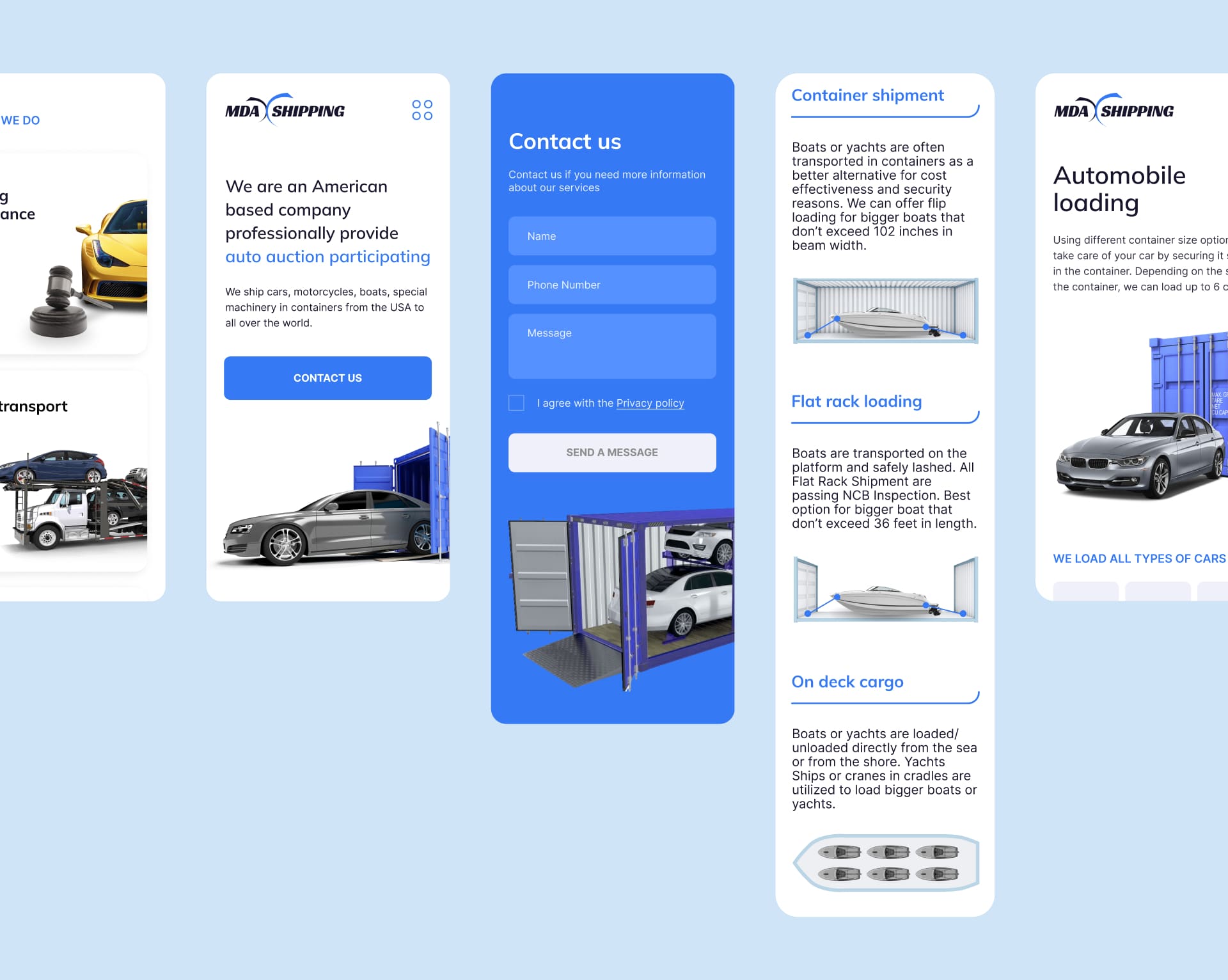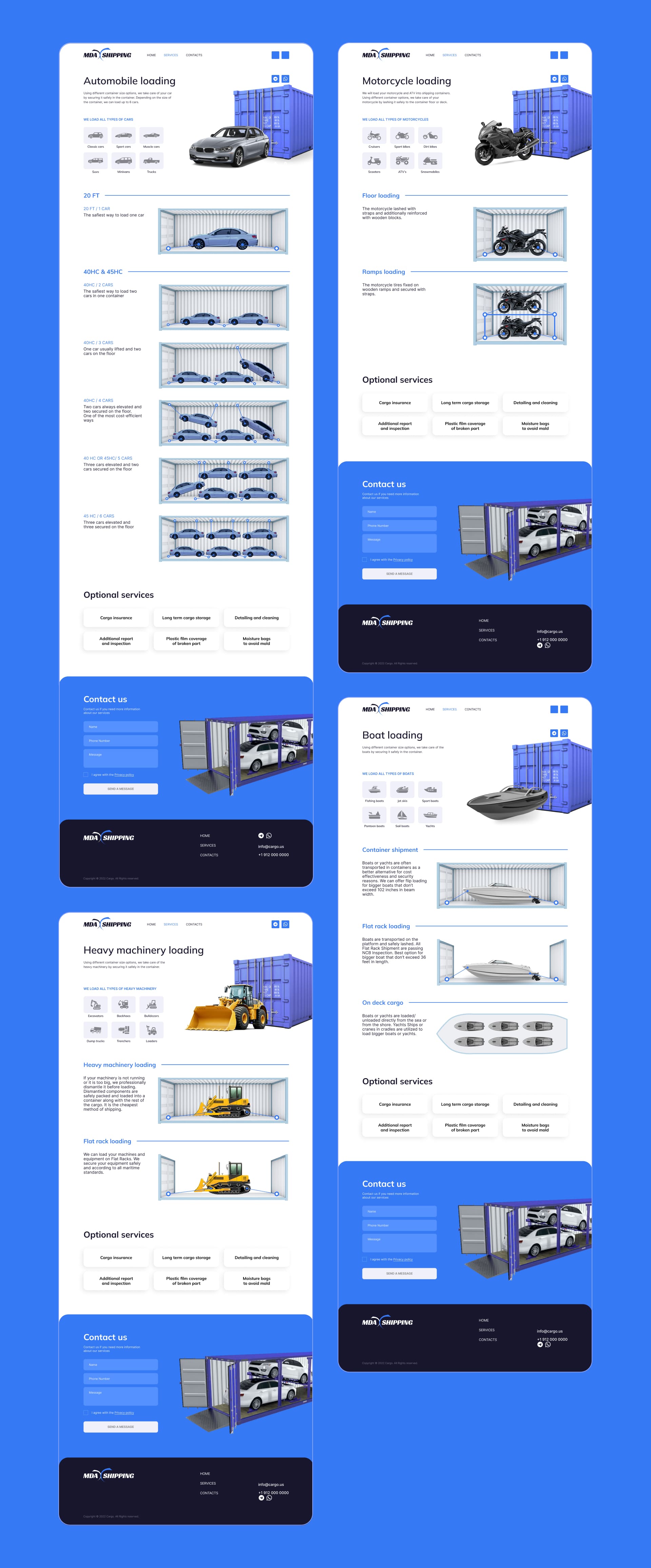 MDA Shipping is engaged in container transportation from the USA to all over the world. A classic multi-page website with schemes of loading cars and equipment into containers was created for MDA.MDA Shipping занимается контейнерными перевозками из США по всему миру. Для MDA был создан классический многостраничный сайт со схемами погрузки автомобилей и техники в контейнеры.